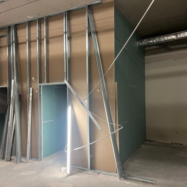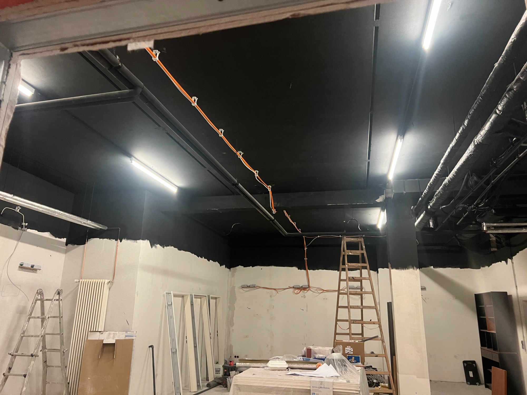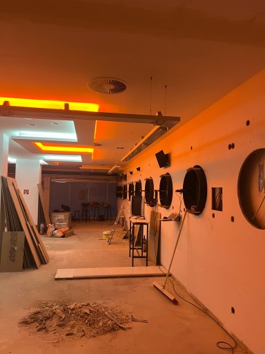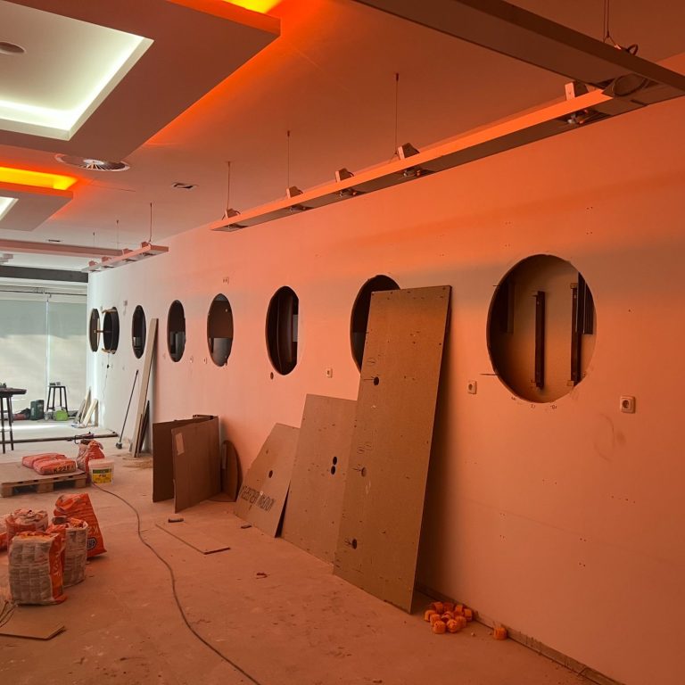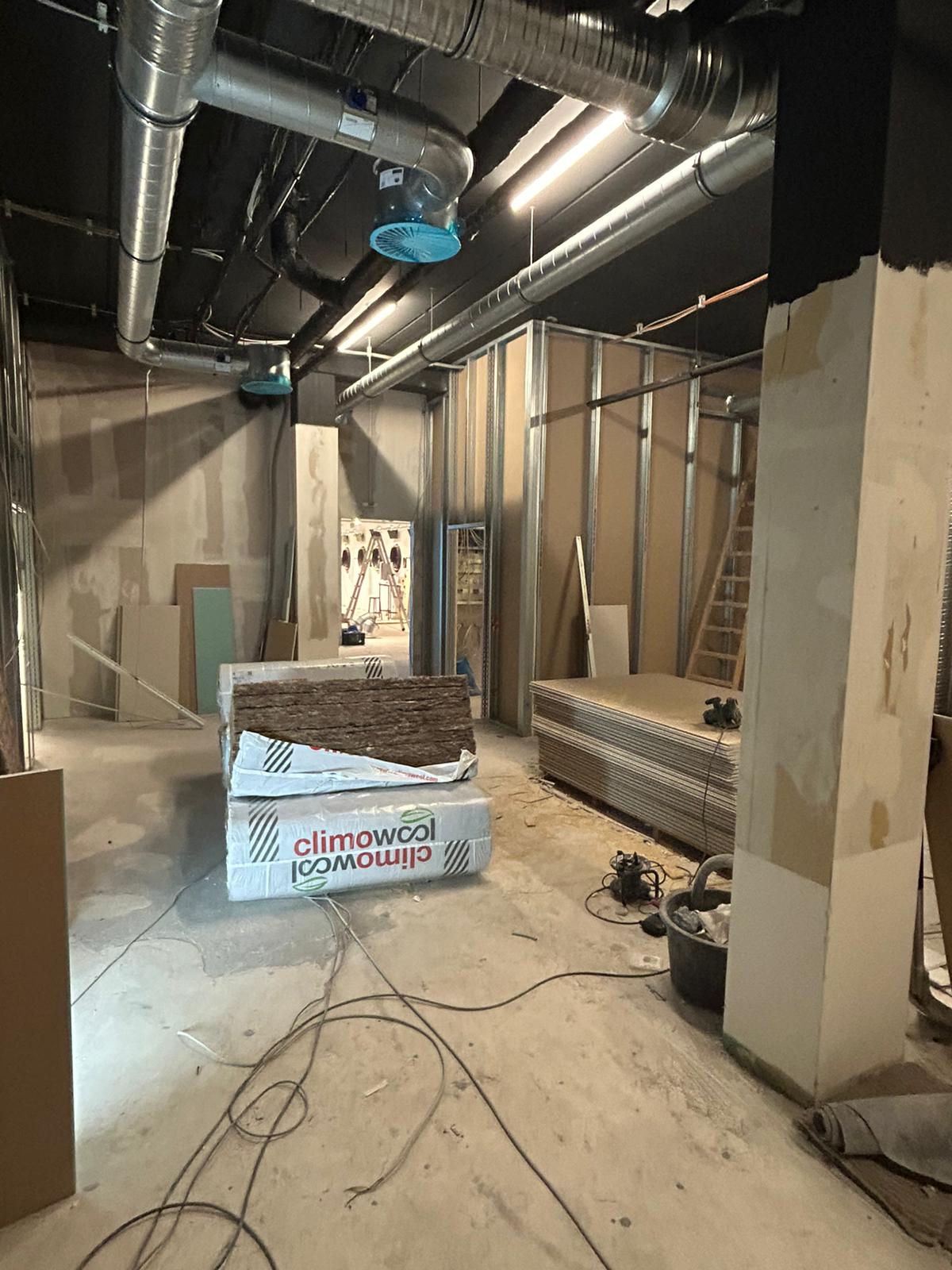 Die Elektrik ist bereits zu rund 80 % fertiggestellt, ebenso der Trockenbau, der dem Raum nun klar seine Struktur gibt. Auch bei den Boardaufnahmen sind wir mit etwa 60 % schon weit vorangekommen. Parallel dazu wurde eine neue Lüftungsanlage installiert, die später für ein angenehmes Raumklima sorgen wird – auch bei voller Auslastung.